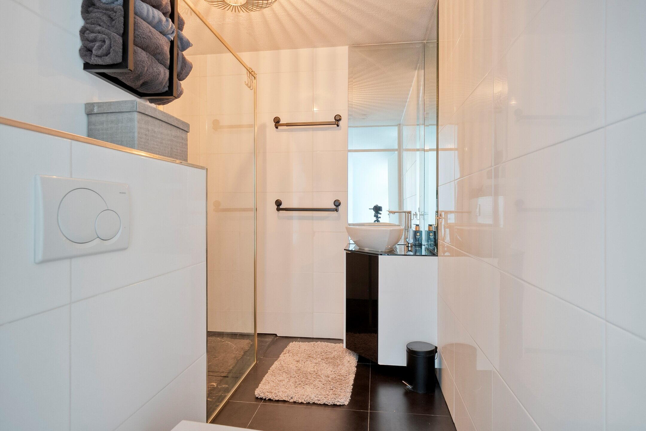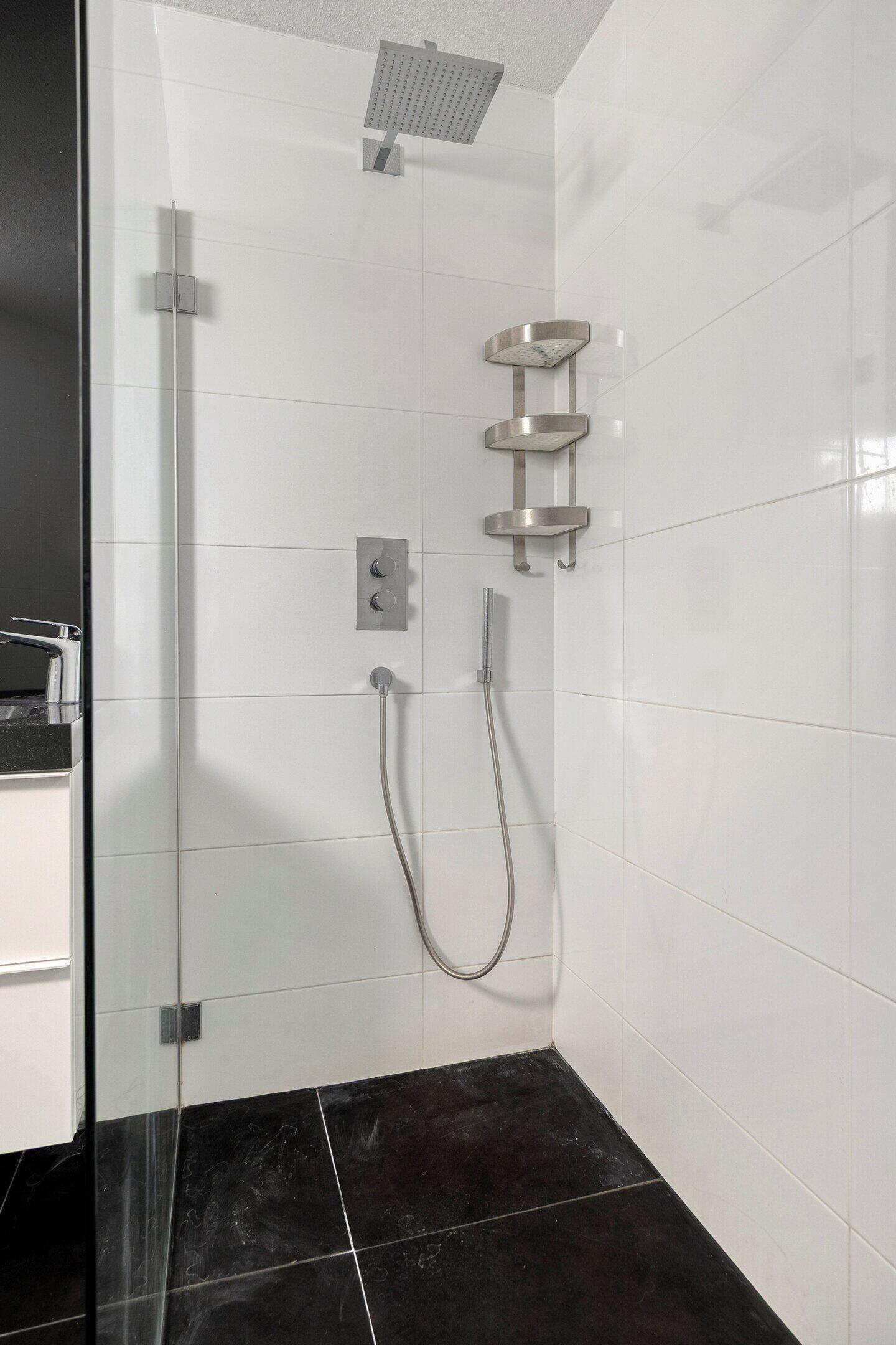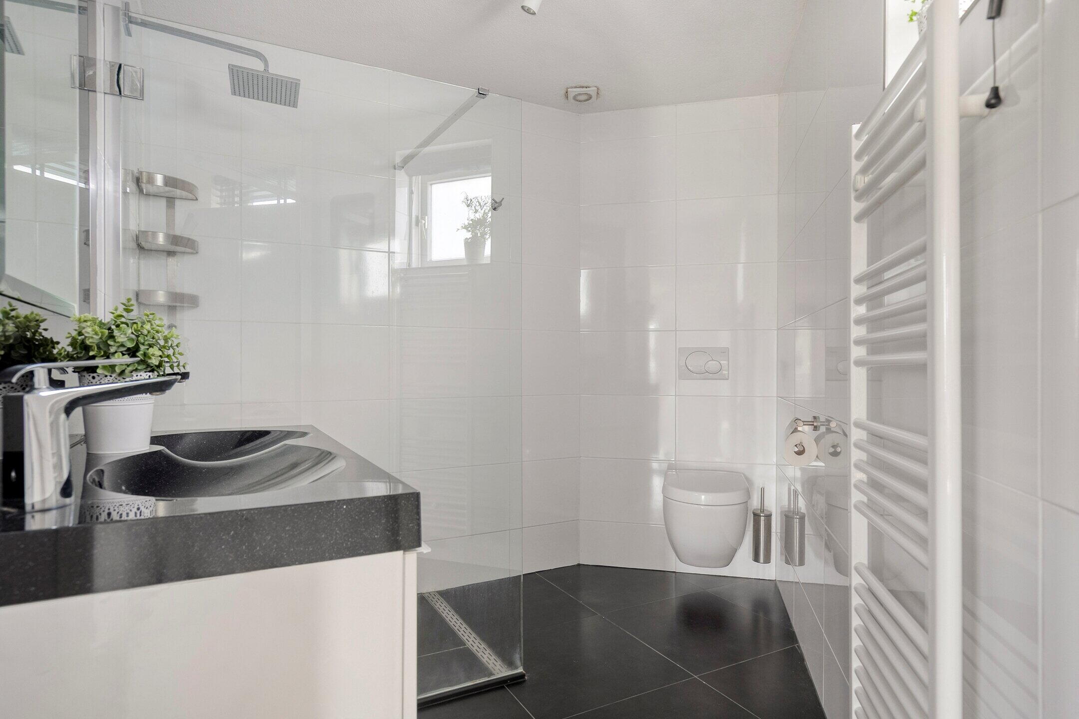 - Toilet, dubbele wasbak, wastafelmeubel, walk in douche