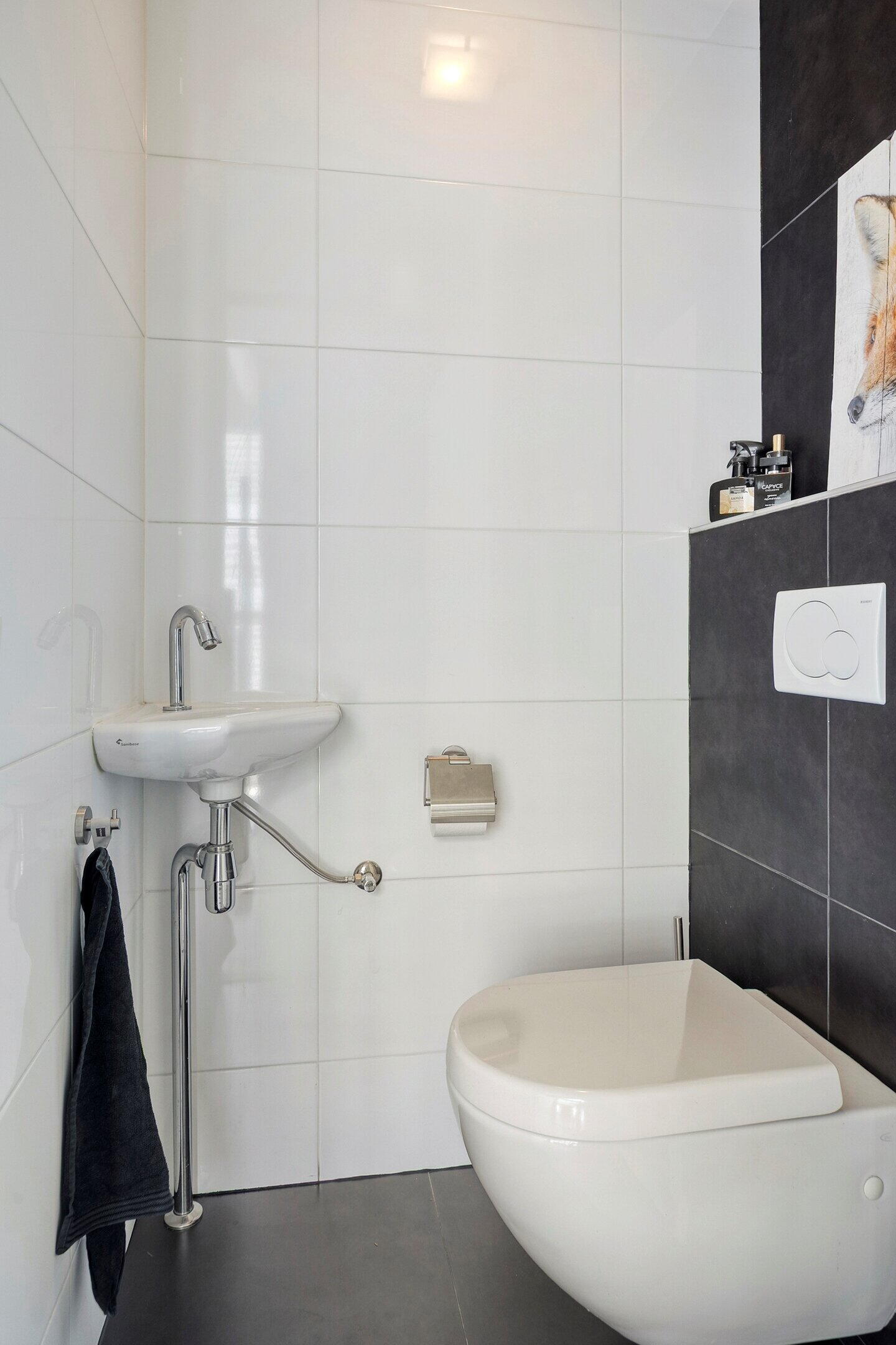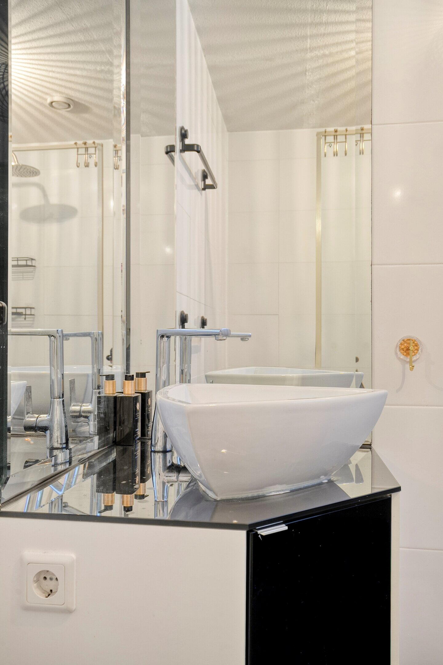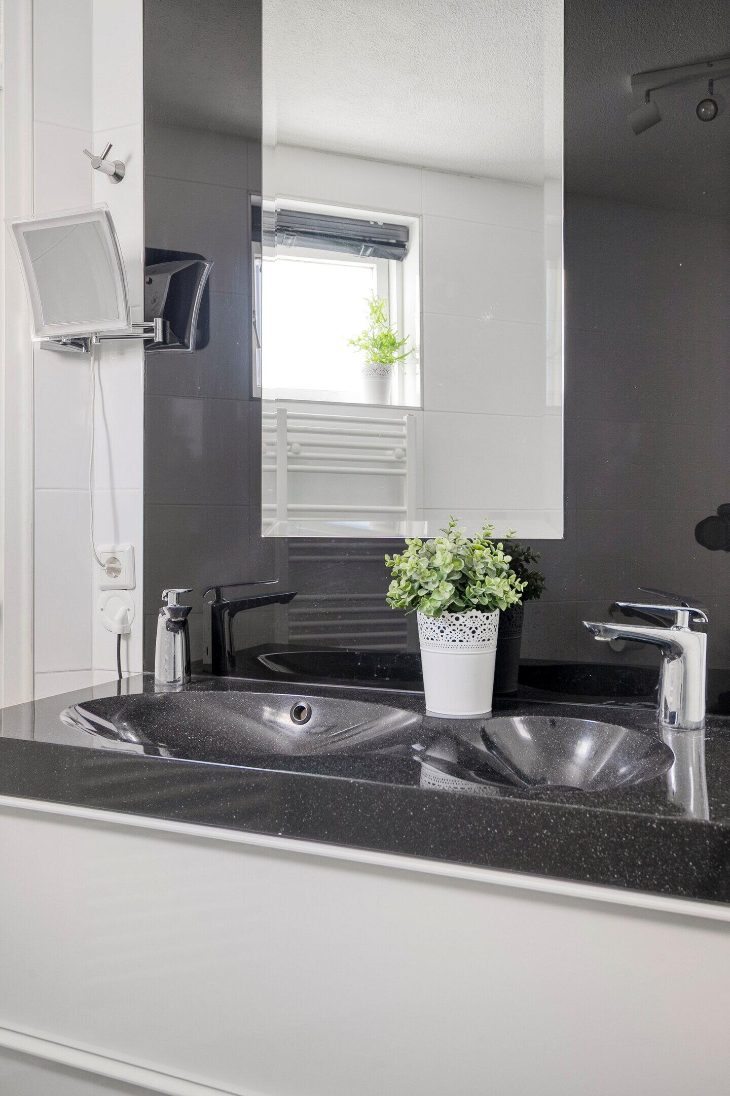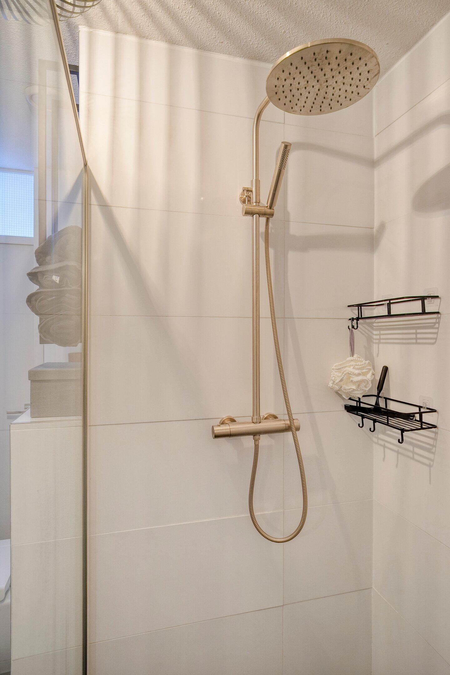 - Toilet, dubbele wasbak, wastafelmeubel, walk in douche