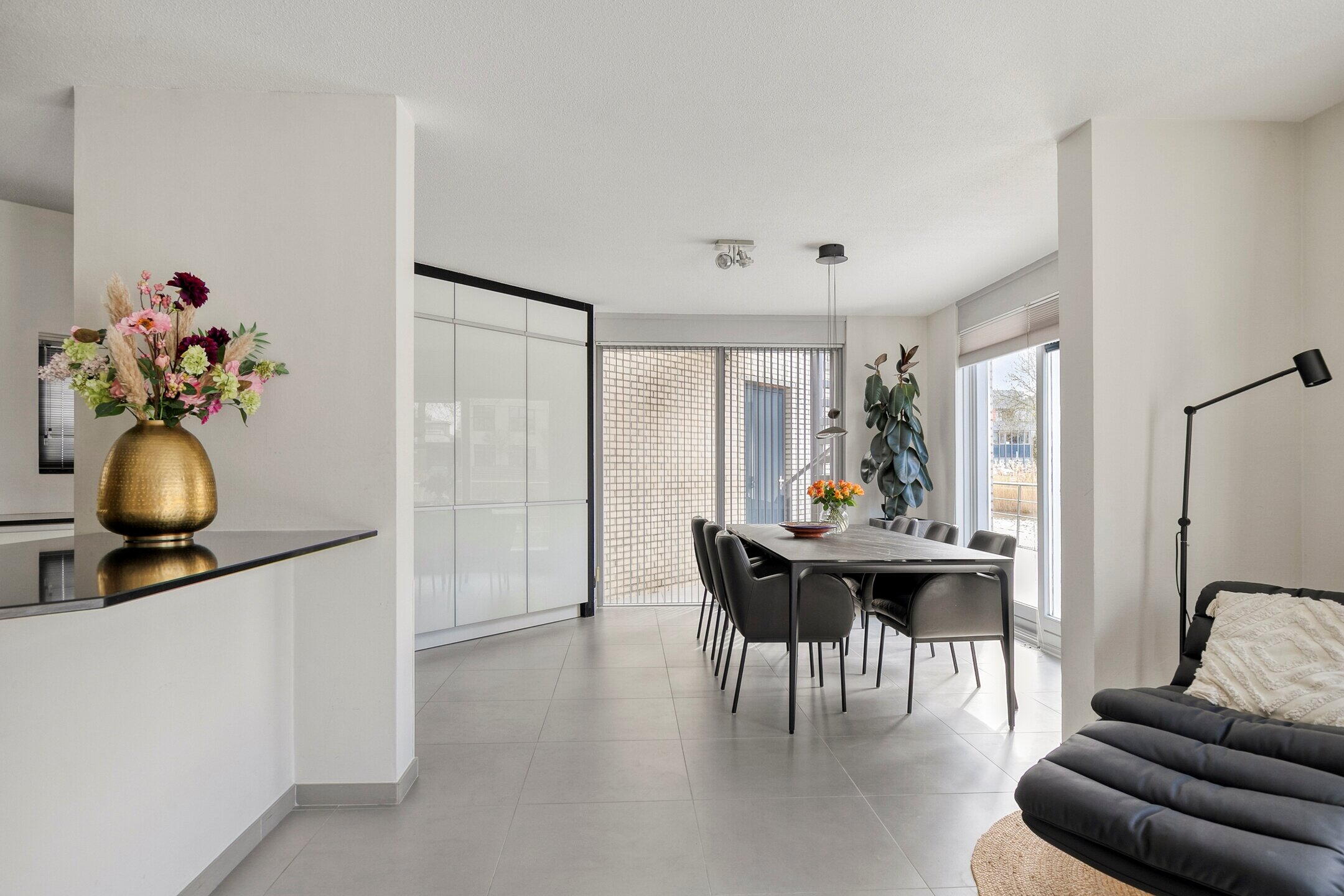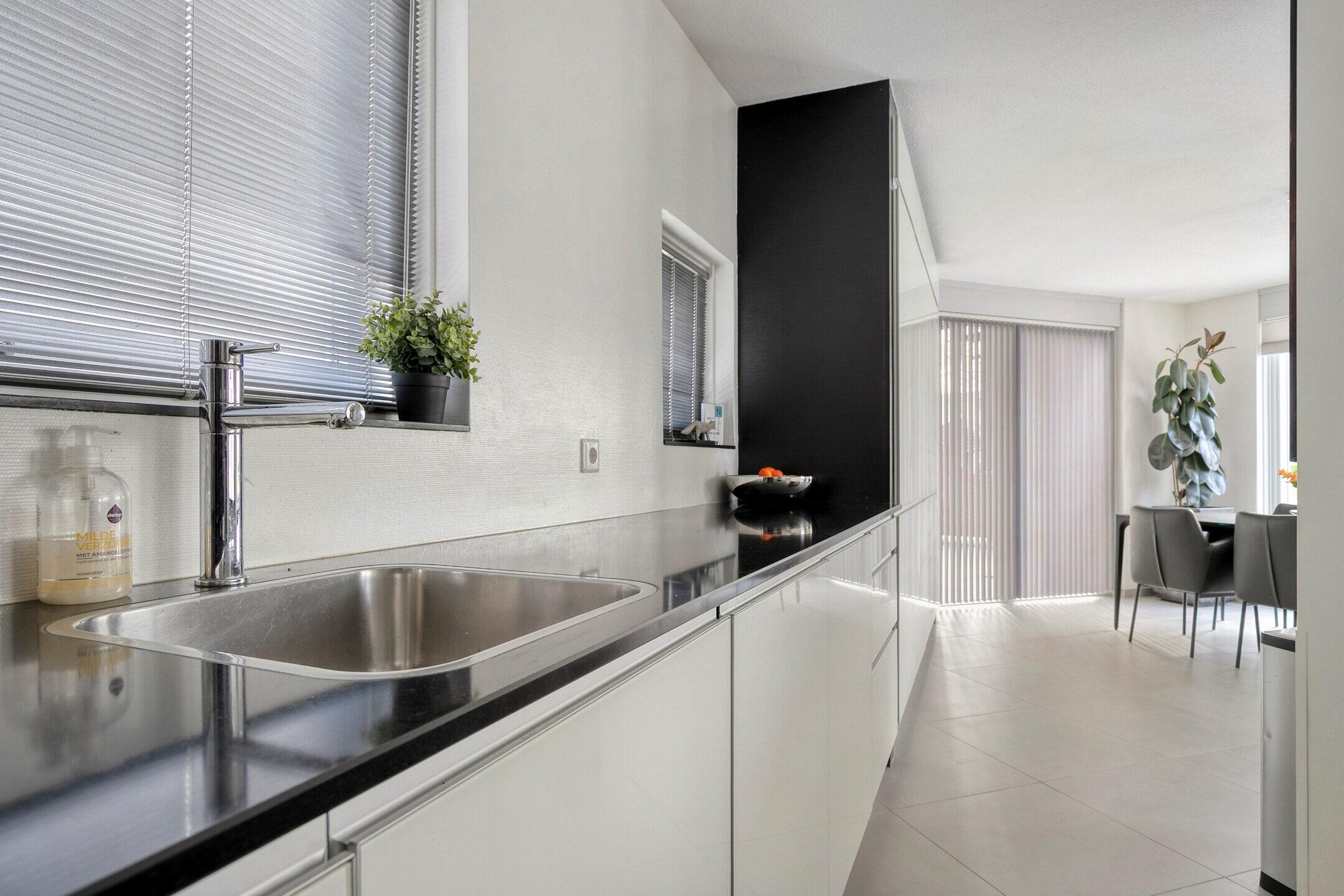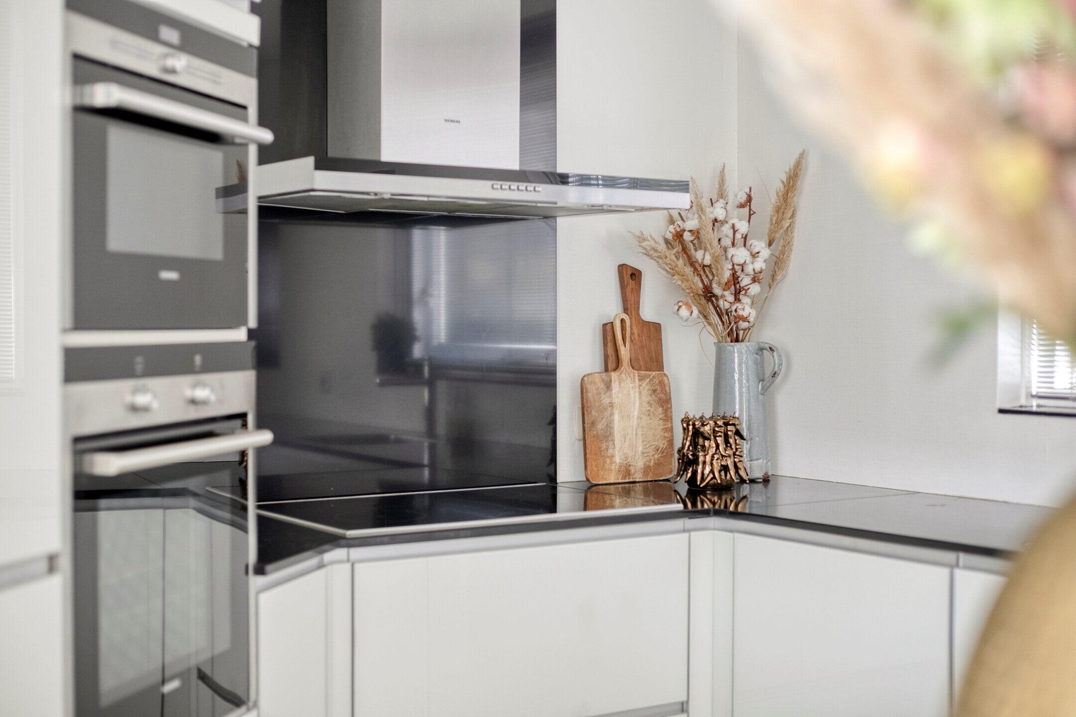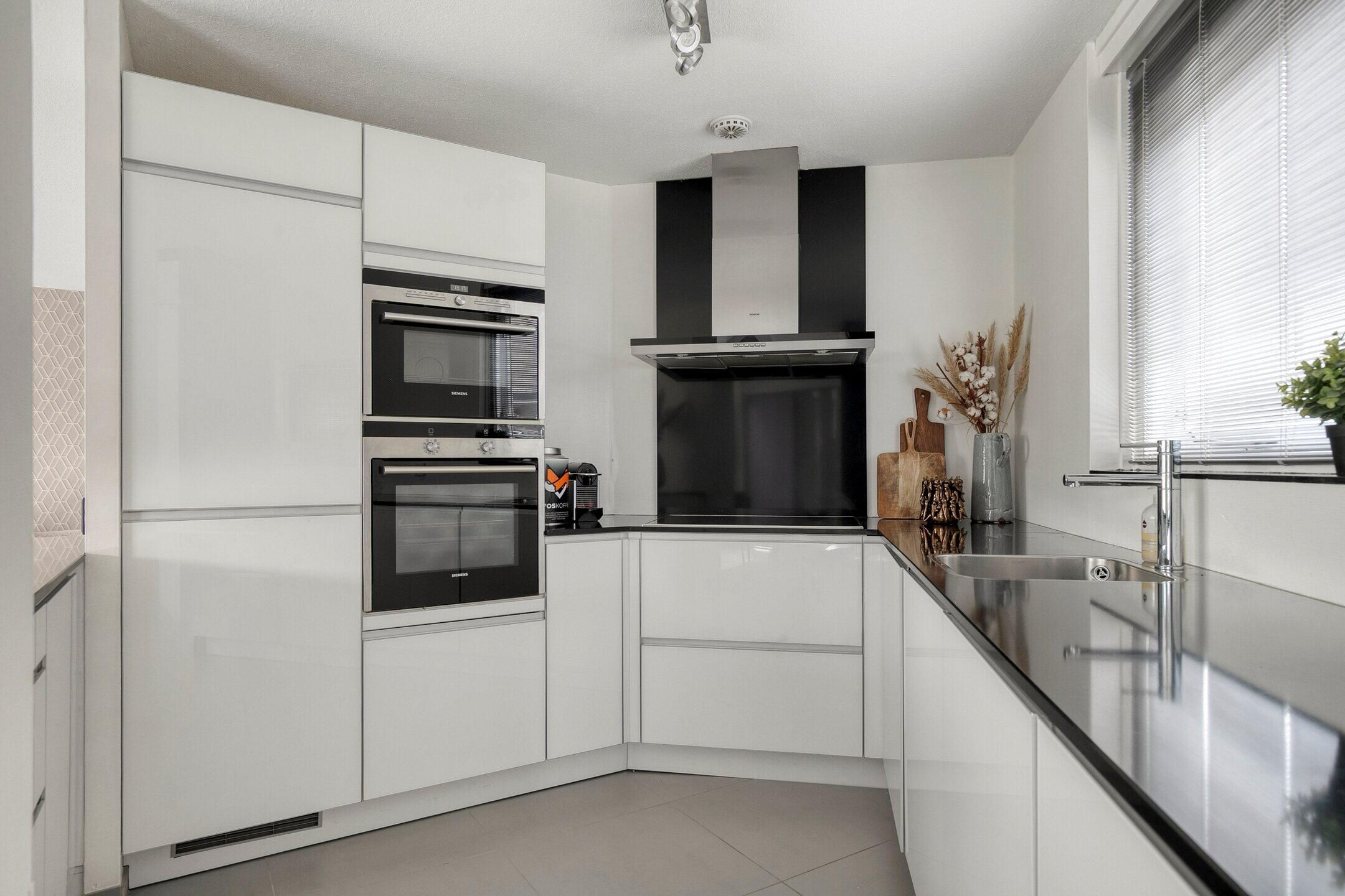 De moderne witte hoogglans keuken is voorzien van alle denkbare hoogwaardige inbouwapparatuur met o.a. een granieten aanrechtblad met spoelbak, inductiekookplaat met afzuigkap, vaatwasser, heteluchtoven, combimagnetron en een koel/vries combinatie. De hoge kastenwand is mooi doorgetrokken naar het eetgedeelte hierdoor heeft u voldoende opbergruimte voor keuken en woonkamer spullen.